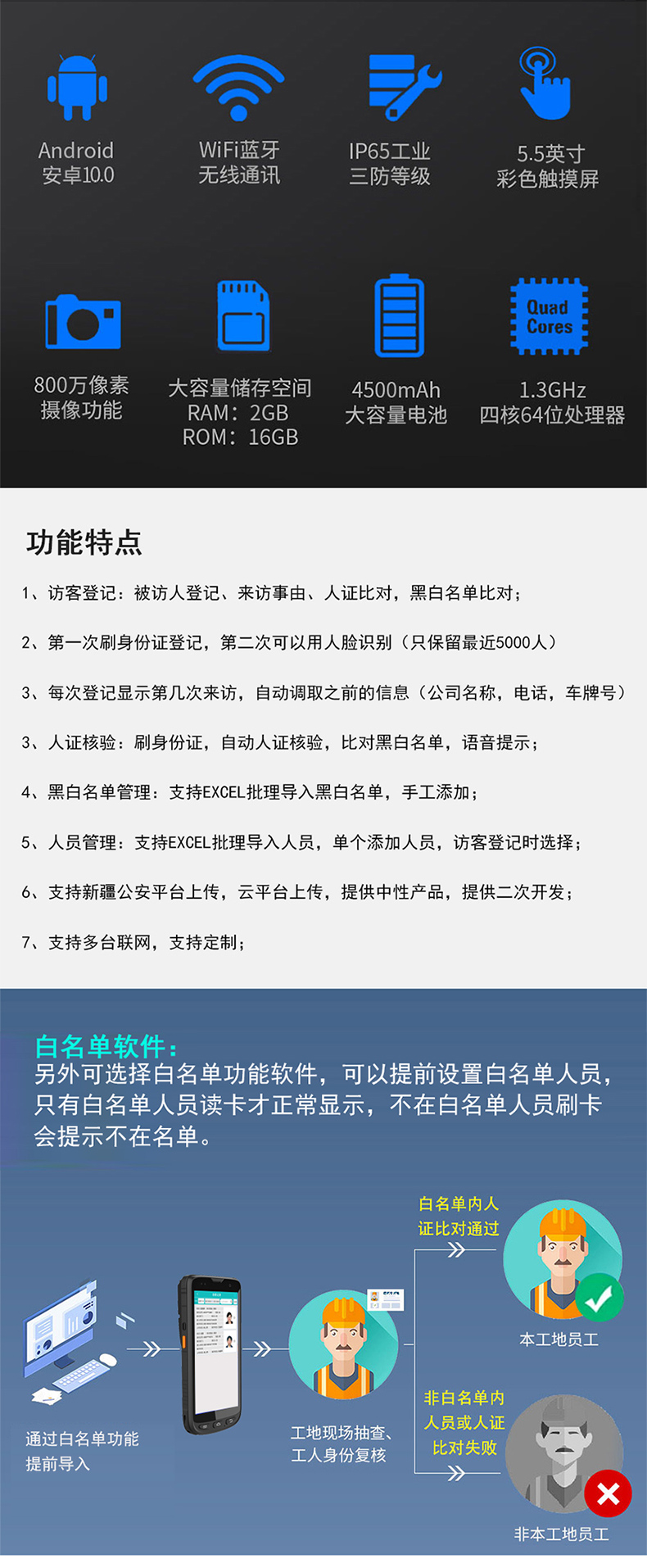 產(chǎn)品支持身份證識(shí)別,人證對(duì)比,黑名單比對(duì),來(lái)訪(fǎng)登記,支持4g,云平臺(tái)上傳,提供二次開(kāi)發(fā),支持訂制