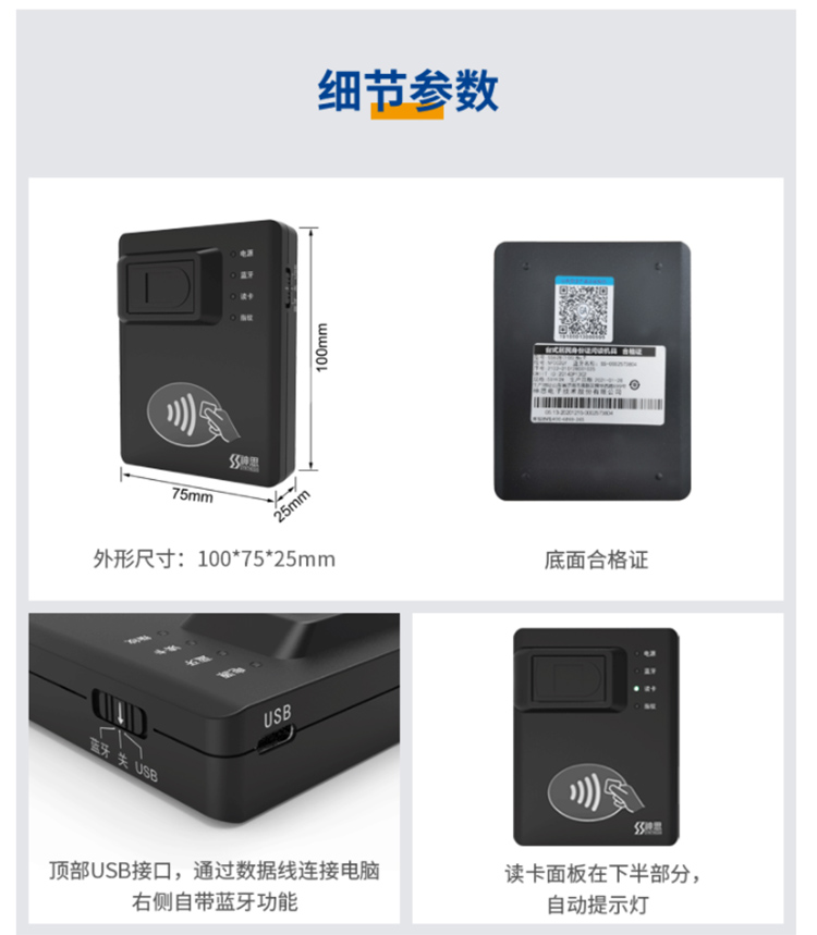 (*由于產品升級或其他原因,神思SS628-100Wm藍牙身份證讀卡器產品實際參數有可能變更,以實際產品為準。本文中的所有陳述、信息和建議也不構成任何明示或暗示的擔保)